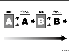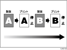 各ページの製版後に一旦停止します。プリント後の次ページの製版は連続で開始され、製版終了後に停止します。製版が終了した状態でプリントモードに切り替わります。プリントを開始する場合は、[スタート]キーを押してください。