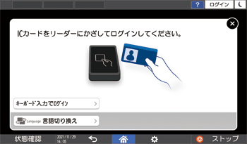 かんたんカード認証では、管理者はカード操作でログインできません。管理者としてログインするときは、[キーボード入力でログイン]を押して、ログインユーザー名とパスワードを入力してログインしてください。