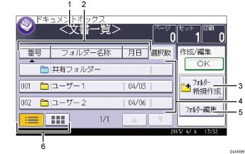 スキャナー機能で蓄積した文書の一覧については、蓄積した文書の一覧画面の見かたを参照してください。