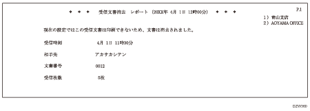 [旧文書を印刷せずレポート出力]を選択したときは、受信文書が消去されると、相手先や受信日時などが記載されたレポートが印刷されます。