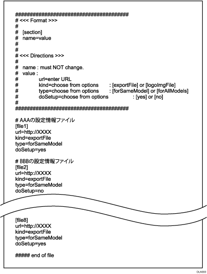 集中管理指示ファイルのフォーマットファイルを本機からダウンロードできます。Webブラウザーで「http://(本機のIPアドレス、またはホスト名)/DH/directionsFormat.ini」をダウンロードしてください。