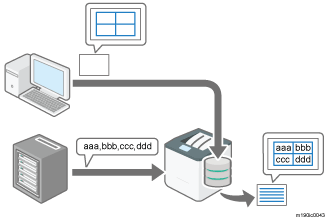 市販のアプリケーションソフトで作成したフォームデータをRPCSプリンタードライバーから本機に登録することで、印刷コマンドによる印刷データにフォームデータを重ねて印刷できます。たとえば、業務基幹システムのデータベースに帳票のフォームを組み合わせて大量に印刷できます。